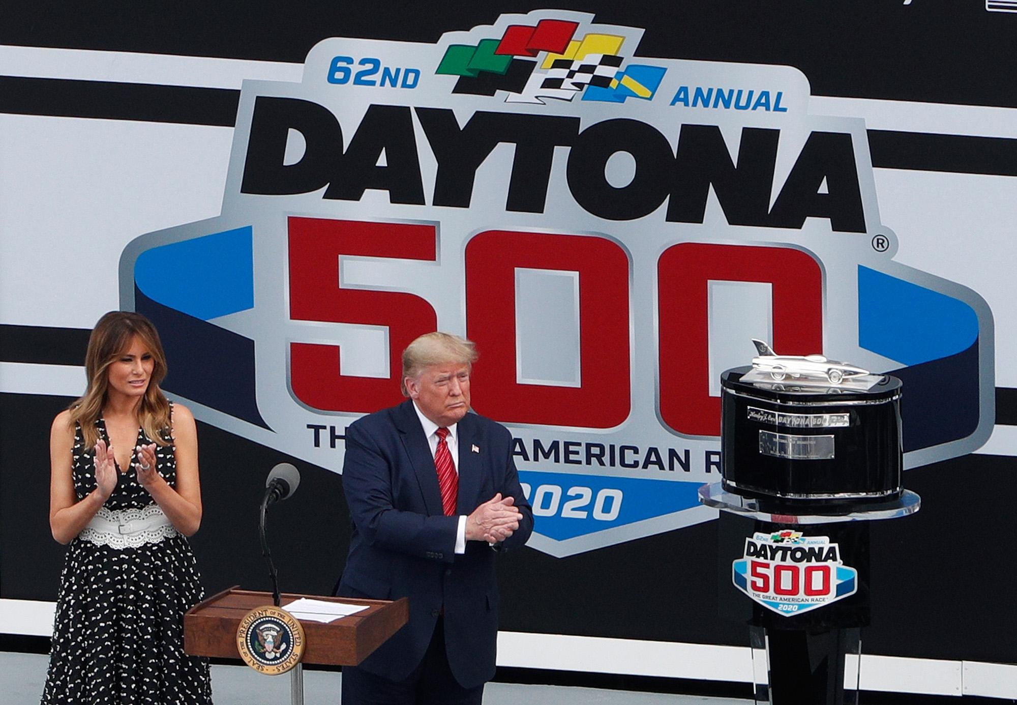 - In February 2020, Donald and Melania Trump returned as president and first lady, with him giving the command for drivers to “start their engines” as Grand Marshal. His presidential motorcade passed the grandstands as he led the drivers around the track before the NASCAR Daytona 500 race, and his presidential limousine − the Beast − did a pace lap. His car also drove on “the apron” of the track. Melania Trump wore a black flared halter dress by Dior with tiny white embellishments and a wide white trim at the waist.